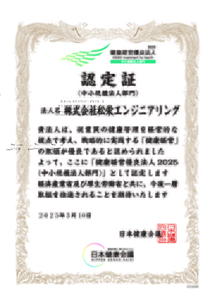 この度、株式会社松栄エンジニアリングは、経済産業省と日本健康会議が進める、健康経営優良法人認定制度において、「健康経営優良法人2025(中小規模法人部門)」の認定を受けました。